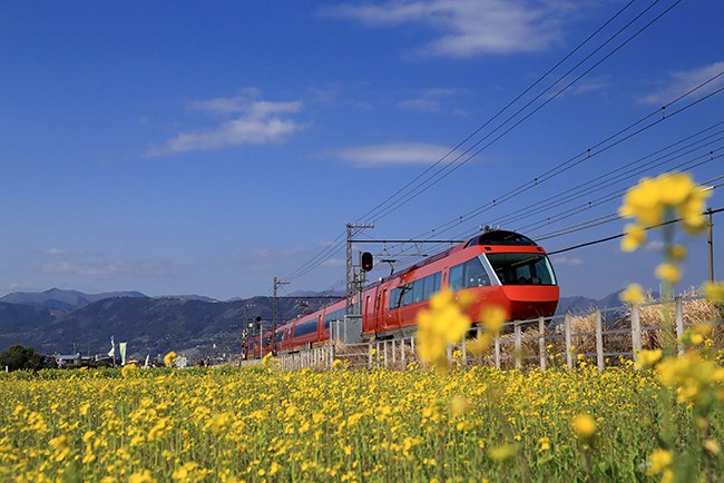 菜の花&小田急 (栢山 2018年3月) 去る鉄もあれば、来る鉄もあります。ダイヤ改正の日は、新型ロマンスカーGSEデビューを祝う春の青空と黄色い菜の花。ワクワクしながら待ちました。やってきたのは新しいのに懐かしい、ちょっとパノラマカー似の新顔でした。