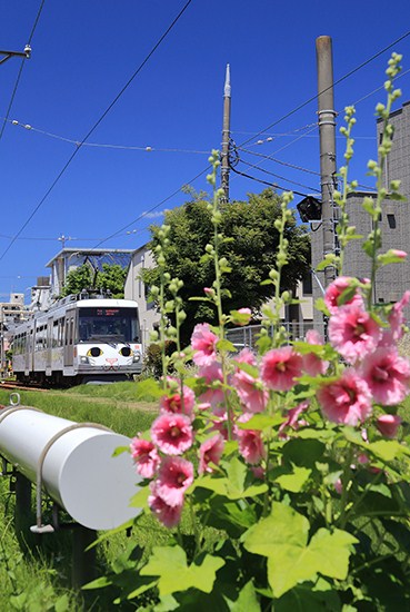 輝く5月の青空の下、タチアオイ咲く世田谷線。招き猫電車は、世田谷線110周年を記念する、期間限定のラッピング車両です。花々とともに沿線の華でした。
