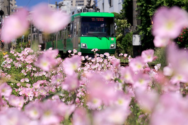 ヒルサキツキミソウ&世田谷線 (松原 2018年5月) この季節、沿線の彩る花のひとつです。撮影の技法というより、今年はこんな感じで咲き乱れるくらい豪勢でした。花の世田谷線、通勤途上にあるので定期券で行ける数少ない遊び場です。
