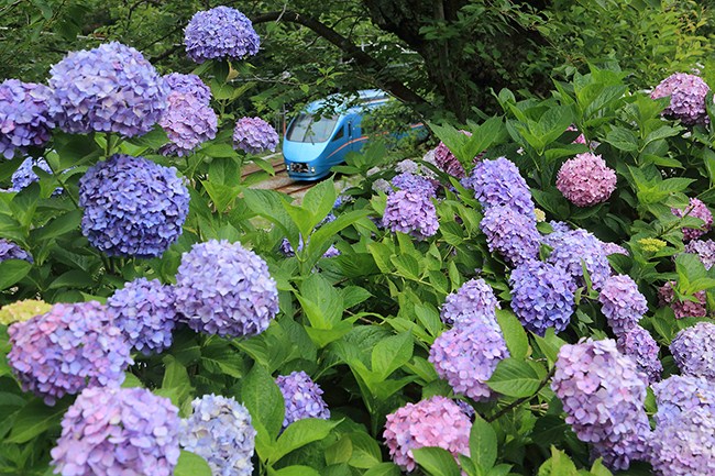 紫陽花&御殿場線 (山北 2018年6月) 雨の季節、紫陽花の季節になりました。小雨模様の梅雨寒の日に訪ねた御殿場線。線路に沿って紫陽花がちょうど見頃でした。じっくり場所を探して、ようやく見つけた、「紫陽花はこんな感じで撮りたい。」とイメージ通りのポイントで、MSEを待ちました。この1年間のベストショットです。