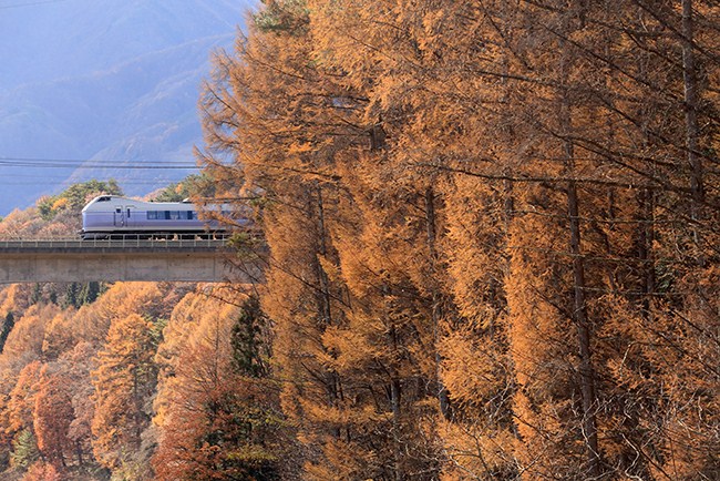 落葉松紅葉&中央本線 (富士見 2017年11月) 急に思い立って、車で信州の高原へ。でも、この落葉松の紅葉を行く中央本線はずっと撮りたかったシーンでした。念願叶う秋、ラストシーズン、E351系スーパーあずさとともに。