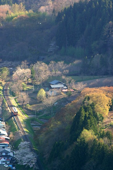 西日が沈まぬタイミングで下り列車が到着。降りて駅の桜も好し、登って好しの、素敵な待ち時間でした。