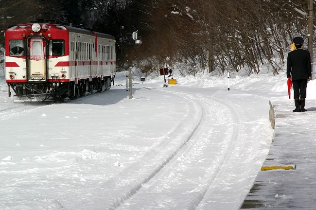 盛岡行きの快速リアスを見送る駅長さんのプロフェッショナルな姿。雪景色の中、いっそう凛々しく写りました。