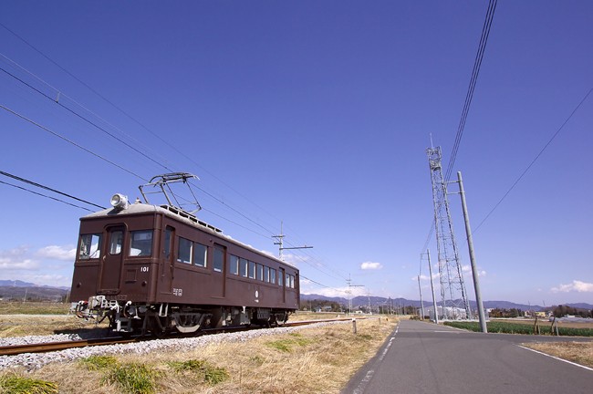 これが走るということで、駆けつけた上毛電鉄。からっ風が冷たい快晴の早春でした。