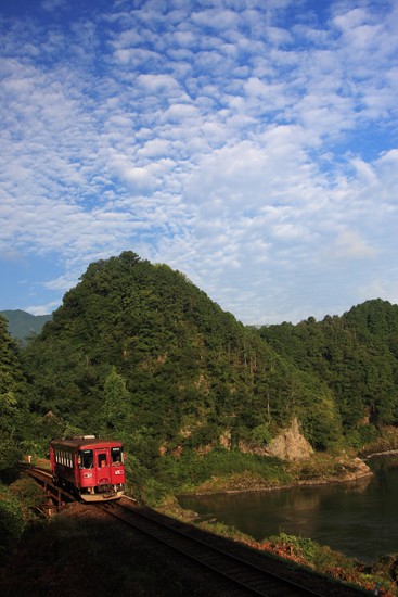 線路に日が差し、空は朝らしい雲。気持のよい夏の朝でした。
