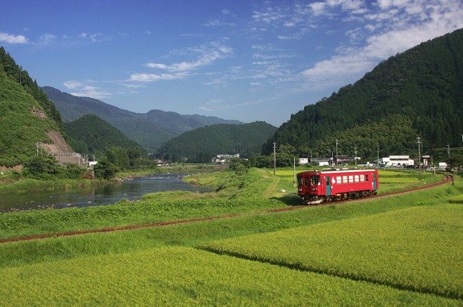 青田、青空、深緑の山々に、紅一点。夏らしい、いい風景です。
