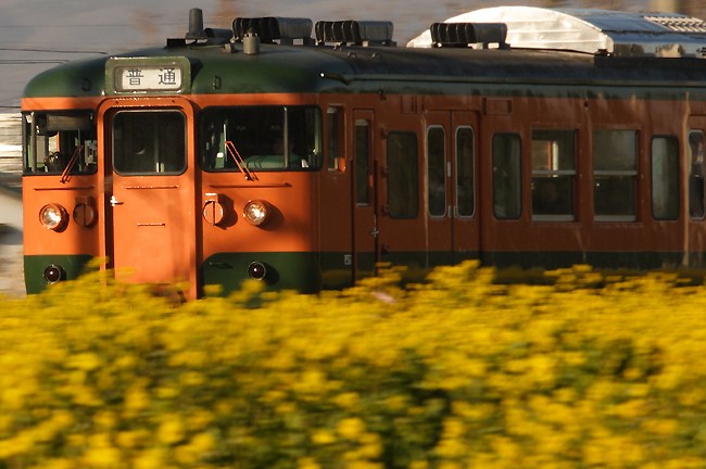 湘南色と菜の花は、合いますね。300mm単での流し、唯一の成功例。