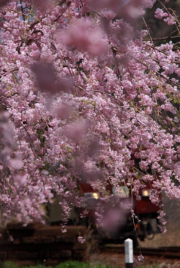 上神梅駅の枝垂桜。少し濃い目の桜の間から銅色のDCが顔を出しました。
