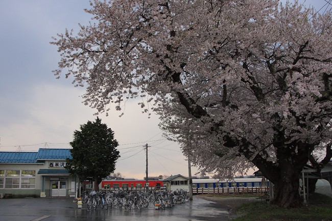 期待していた西米沢の駅桜も、しっとり春雨の中、満開を迎える。